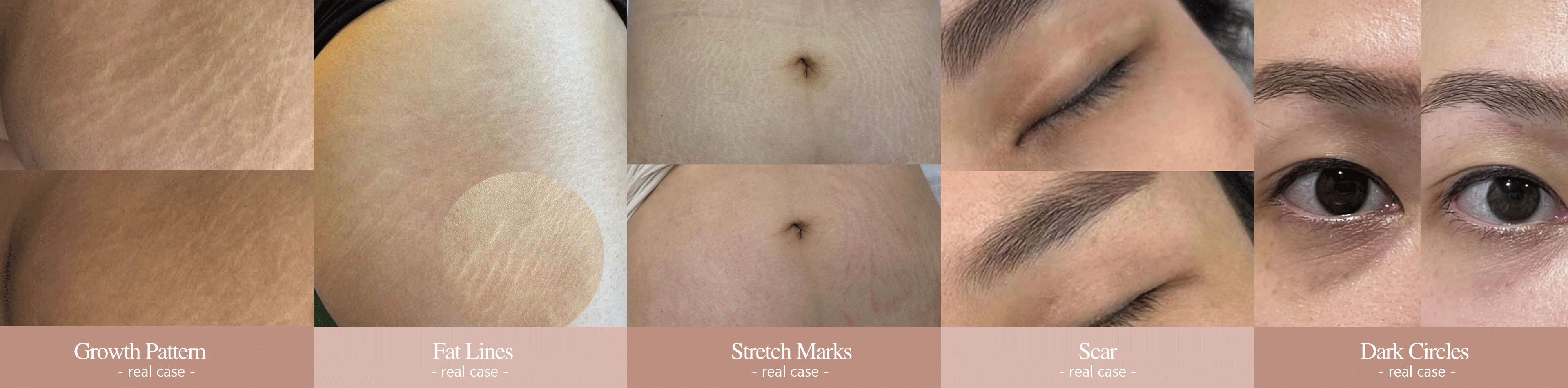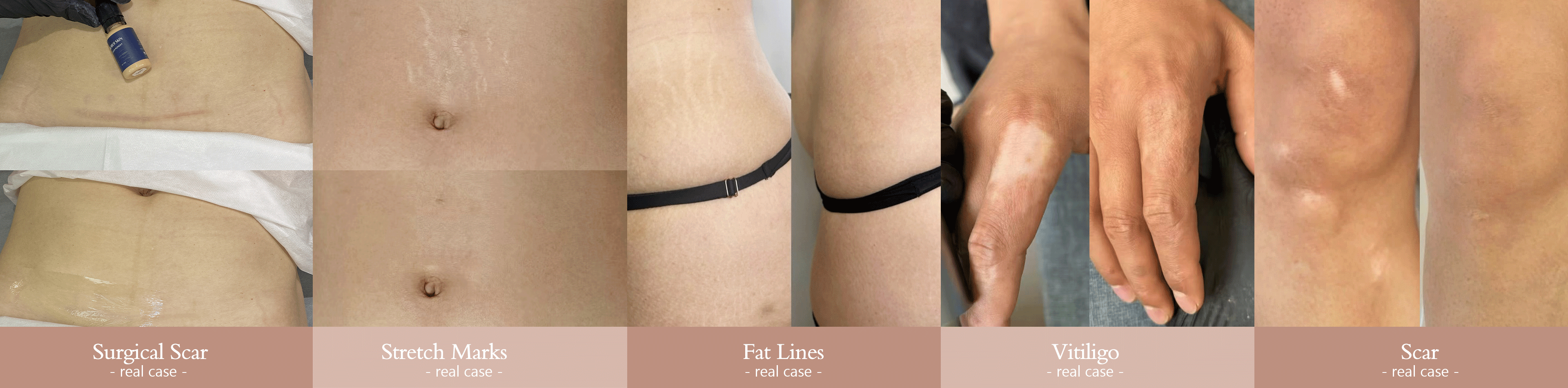 • SOLVE SKIN PROBLEMS SUCH AS STRETCH MARKS, OBESITY MARKS, GROWTH MARKS, VITILIGO, SCARS, LOCAL PIGMENTATION, DARK CIRCLES, ETC.